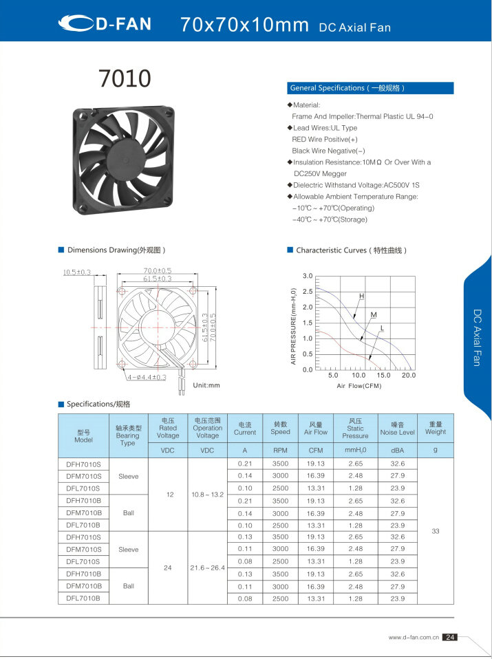 材料: 框架和叶轮:热塑UL 94-0 引线.UL类型 红色导线正极(+) 黑线负极(-) 绝缘电阻:10MΩ或以上,带DC250V高阻表 介电耐压:AC500V 1S 允许环境温度范围: -10℃-+70℃(运行) -40℃-+70℃(储存)